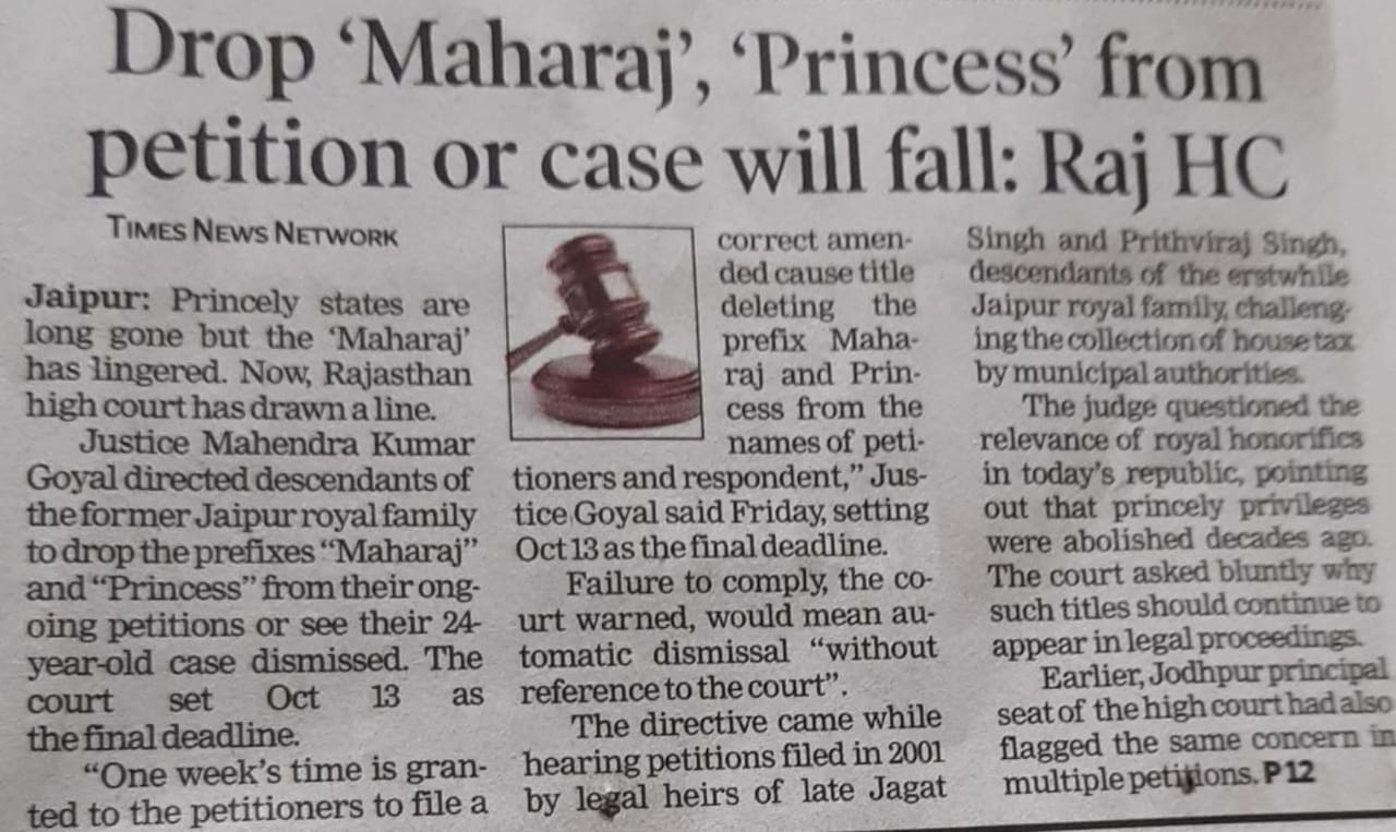 जयपुर हाईकोर्ट में जस्टिस गोयल ने याचिका में महाराजा और प्रिंस शाही संबोधनों का इस्तेमाल पर सख्त लहजे में सवाल कर उनके वकील को चेतावनी दी की इन संबोधनों को हटा संशोधित याचिका पेश करें,वरना याचिका स्वत: ख़ारिज मानी जाएगी.जयपुर हाईकोर्ट पहले भी शाही संबोधनों के लिए केंद्र और राज्य सरकार से जवाबतलब कर चुका है.जोधपुर पीठ भी इन संबोधनों पर चिंता व्यक्त कर चुकी है.मध्यप्रदेश में शिवराज मुख्यमंत्री थे तब मंत्री यशोधरा राजे के दबाव में सर्कुलर जारी करवाया की यशोधरा राजे के नाम से पहले श्रीमंत संबोधन लगाया जाए.बाद में जगहंसाई होने पर इसे वापस लेना पड़ा था.इन परिवारों में जमीन जायदाद को लेकर झगड़े और कोर्टबाजी भी होती है.ग्वालियर में ज्योतिरादित्य और उनकी तीन बुआओ के बीच हाईकोर्ट में डेढ़ दशक से मामला चल रहा है.नवाब पटौदी,जो भोपाल रियासत के भी वारिस थे,के एक्टर बेटे सैफ का परिजनो से विवाद चल रहा है.